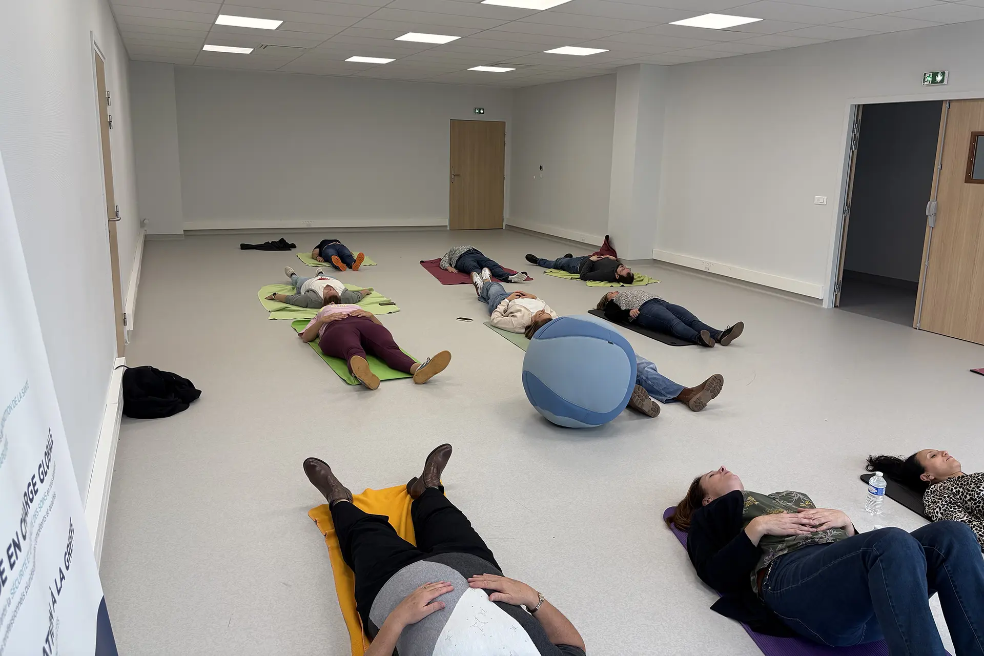 La deuxième partie a été consacrée aux techniques d’auto-traitement des douleurs rachidiennes et appendiculaires fréquemment rencontrées dans le milieu infirmier. À travers des exercices simples d’extension rachidienne, de renforcement musculaire et d’étirements ciblés, les professionnel·les ont pu découvrir des stratégies efficaces pour soulager leurs douleurs et améliorer leur confort au quotidien.